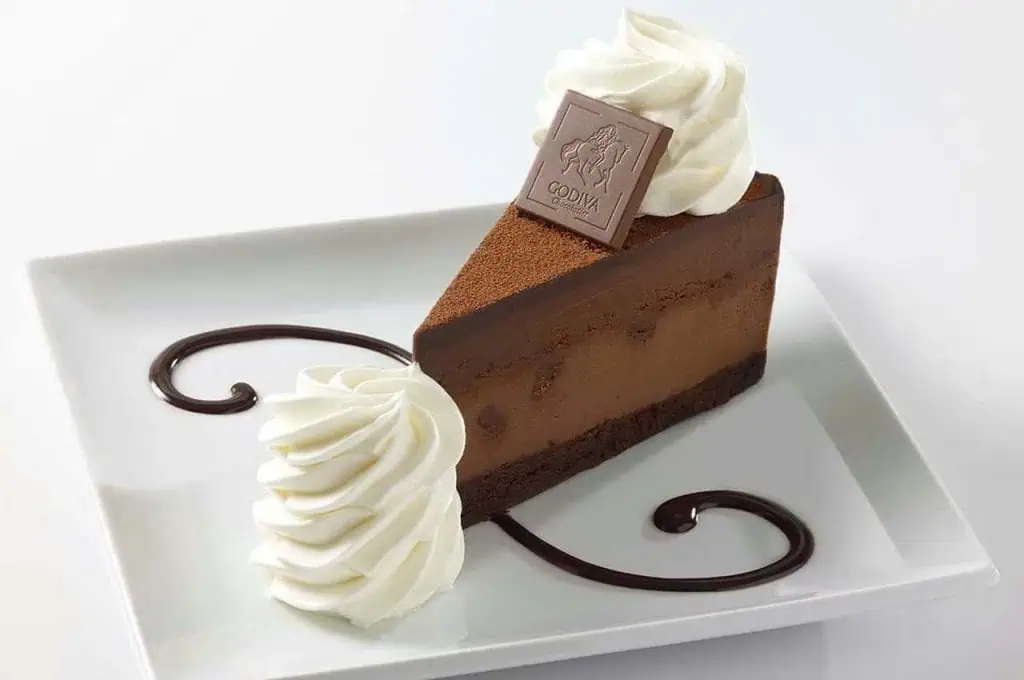 The Godiva Chocolate Cheesecake is a chocoholic’s fantasy. Made with layers of chocolate cheesecake and topped with glossy ganache, it leans fully into deep, cocoa-forward intensity. The texture is thick and almost fudge-like, making it feel more like a slice of chocolate truffle cake than traditional cheesecake.