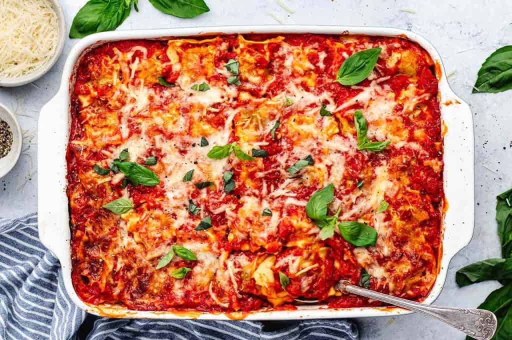 Boil store-bought ravioli until just tender. In a baking dish, spread a layer of marinara sauce, followed by ravioli, then ricotta mixed with spinach and parmesan. Repeat layers, finishing with mozzarella. Bake at 375°F until cheese is melted and bubbly. This clever shortcut lasagna uses ravioli for speed without sacrificing taste. Garnish with fresh basil for an aromatic touch. The simplicity and richness make it an ideal quick dinner option.