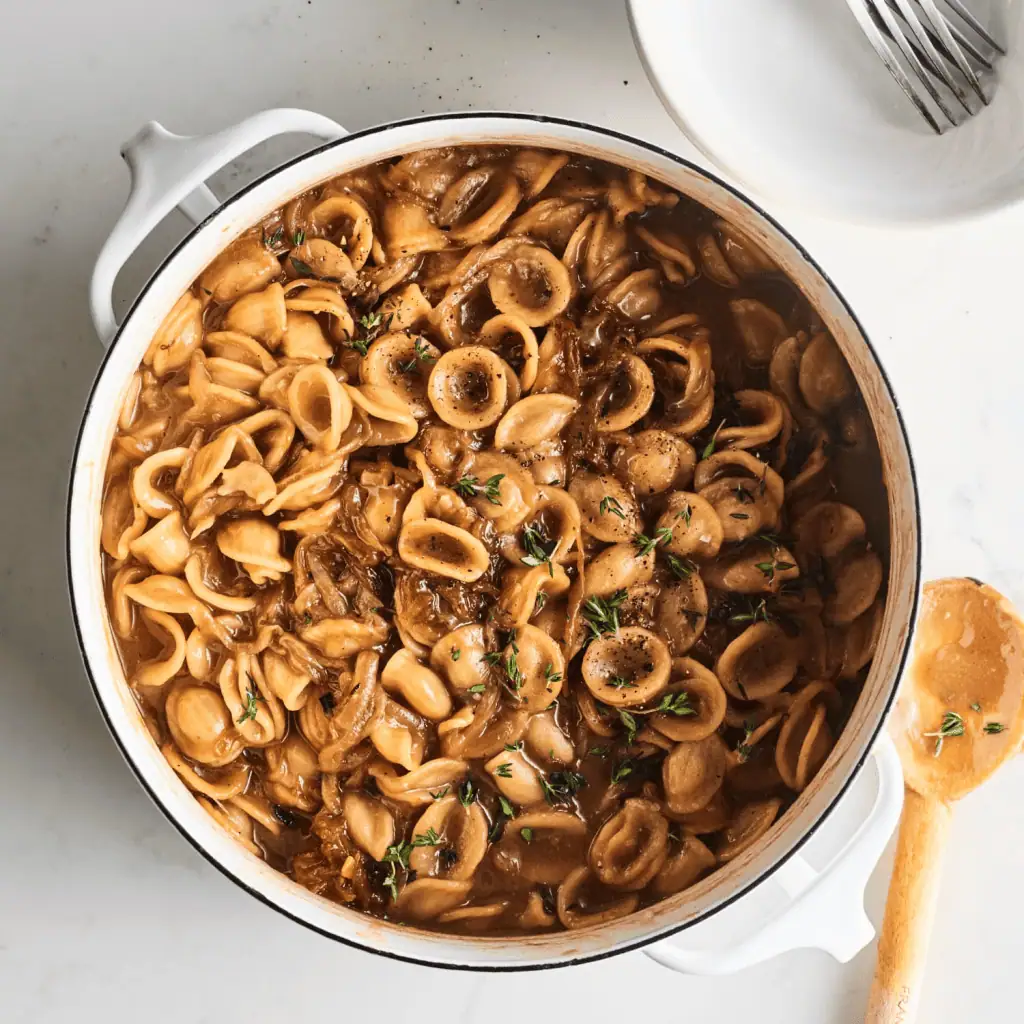 Merging two viral categories, French onion soup and one-pot pasta, this TikTok creation layers caramelized onions, broth, pasta, and melted cheese into a deeply savory dish. It captures the rustic richness of classic French onion soup but adds enough carbs to make it a satisfying main course. The dramatic cheese pull moment makes it irresistible for creators filming quick reels.