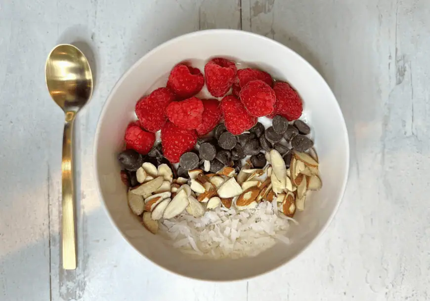 This combination balances tart, rich, and creamy elements. Raspberries cut through the heaviness of almond butter, while dark chocolate adds depth without excess sweetness. Americans enjoy this bowl because it feels indulgent but controlled. It’s especially popular as a dessert alternative, offering satisfaction without the portion creep of traditional sweets. The contrast in textures keeps it interesting.