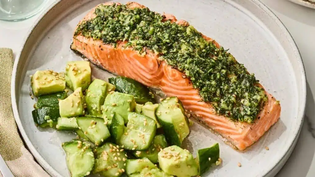 This dish marries the freshness of a Caprese salad with the rich taste of roasted salmon. Season salmon fillets with salt, pepper, and a brush of olive oil, and roast until flaky. Arrange ripe tomatoes and fresh mozzarella slices on a platter, drizzling with balsamic glaze and basil. Place the roasted salmon over the salad for a fusion of warmth and freshness. Each bite delivers luxurious flavors with creamy, tangy contrasts.