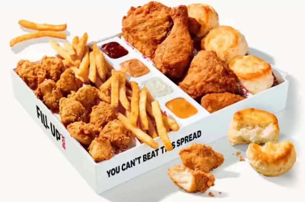 Designed for sharing, the $20 Fill-Up Feast delivers home-style comfort with eight pieces of crispy fried chicken, a large serving of coleslaw, four biscuits, and your choice of sides. Focus on the chicken's golden, crunchy coating and juicy interior by serving promptly. The coleslaw provides a refreshing crunch through its creamy dressing and finely shredded cabbage, while the fluffy biscuits add a buttery note. For added flavor, warmth the biscuits just before serving to enhance their aroma.