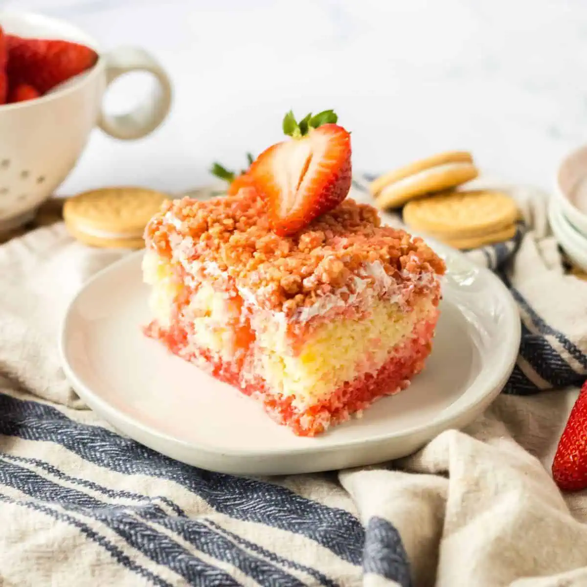 - Top this strawberry crunch poke cake with freshly sliced strawberries for extra flavor, texture, and a pop of color!