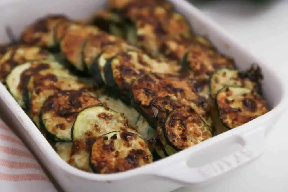 - In a small casserole dish that fits into your air fryer, add a layer of zucchinis overlapping in rows.