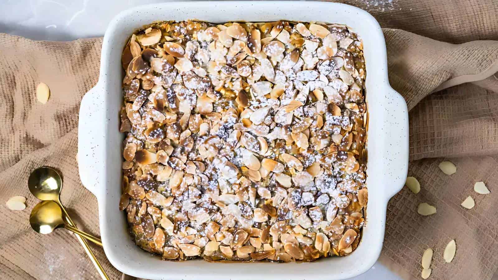 Creamy baked oats inspired by the flavors of an almond croissant make breakfast extra special. With almond milk, almond butter, and sliced almonds, this recipe is packed with almond goodness. It's perfect for busy mornings or meal-prepped breakfasts.