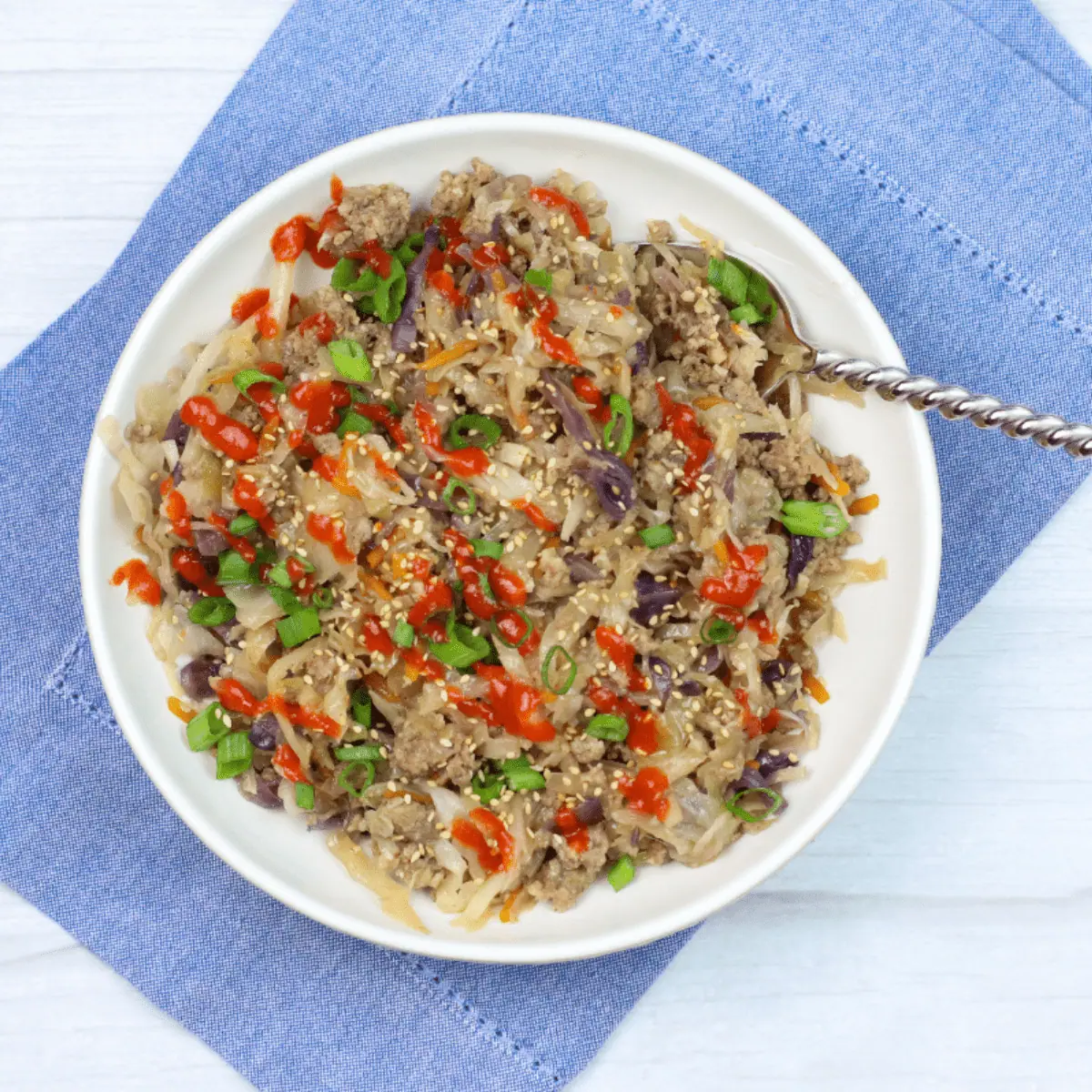 All the egg roll flavors, none of the frying. Cabbage, pork, and sesame with green onionsโfinished with a sriracha drizzle to taste. Low lift and meal-prep friendly.