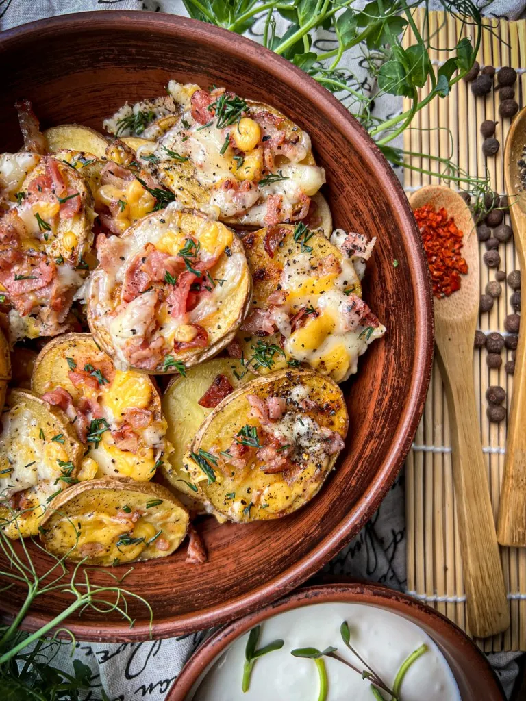 - Sprinkle potato slices with fried bacon and cheese.