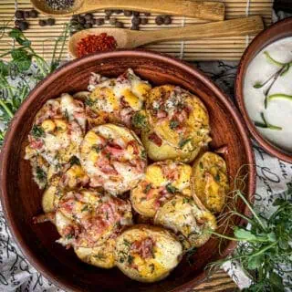 The best part? Theyโre so easy! Just slice up your potatoes and bake with oil and seasonings. Right at the end, top with some cheese and bacon and bake for a few more minutes. Add some fresh herbs and youโre all set!