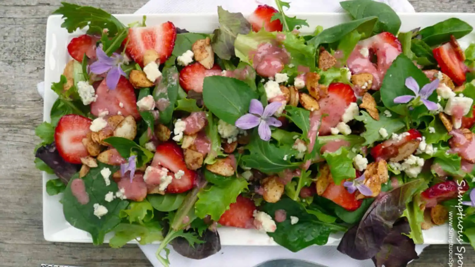 Strawberry Almond Salad with Wild Violets. Photo credit: Sumptuous Spoonfuls.