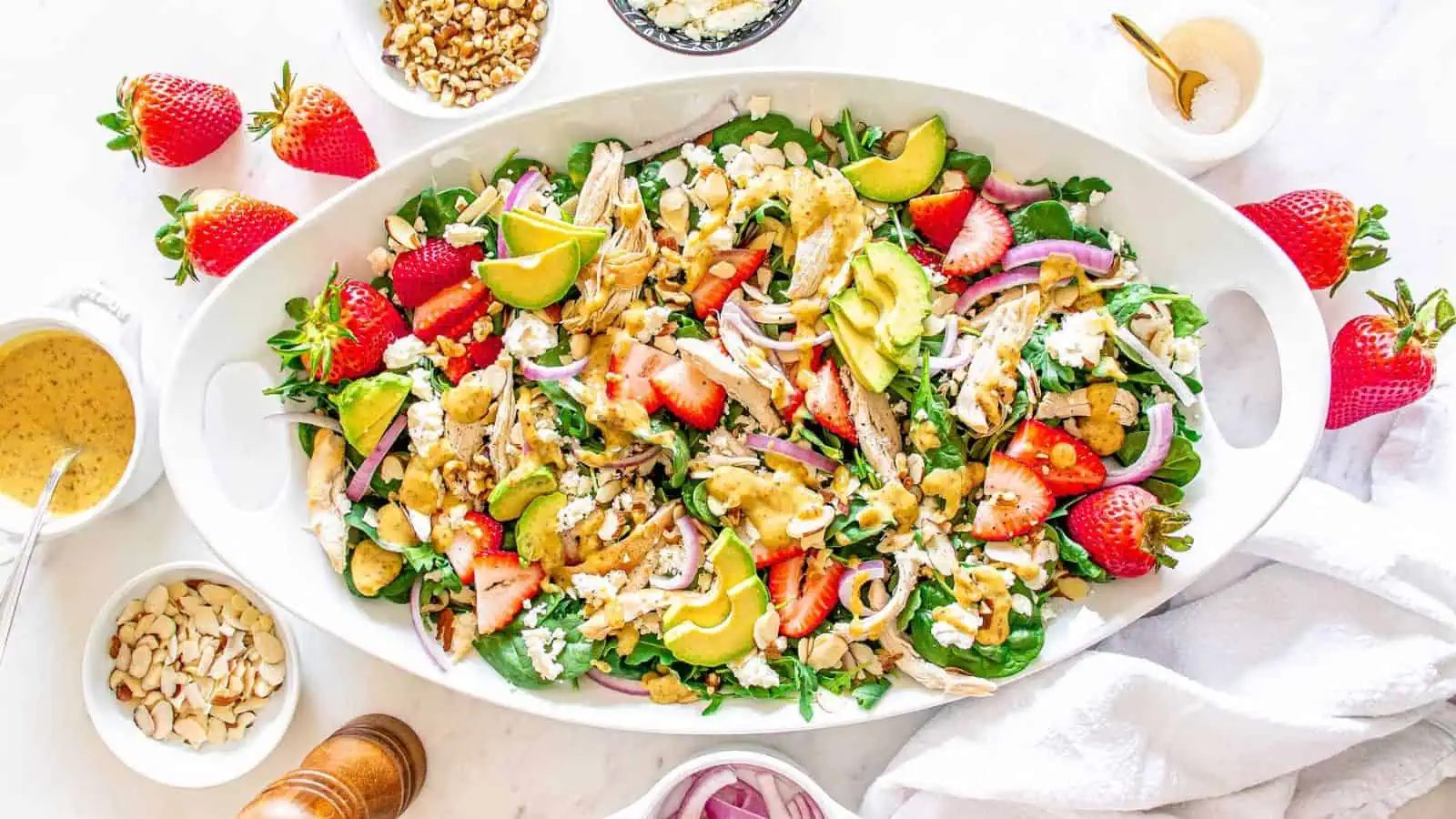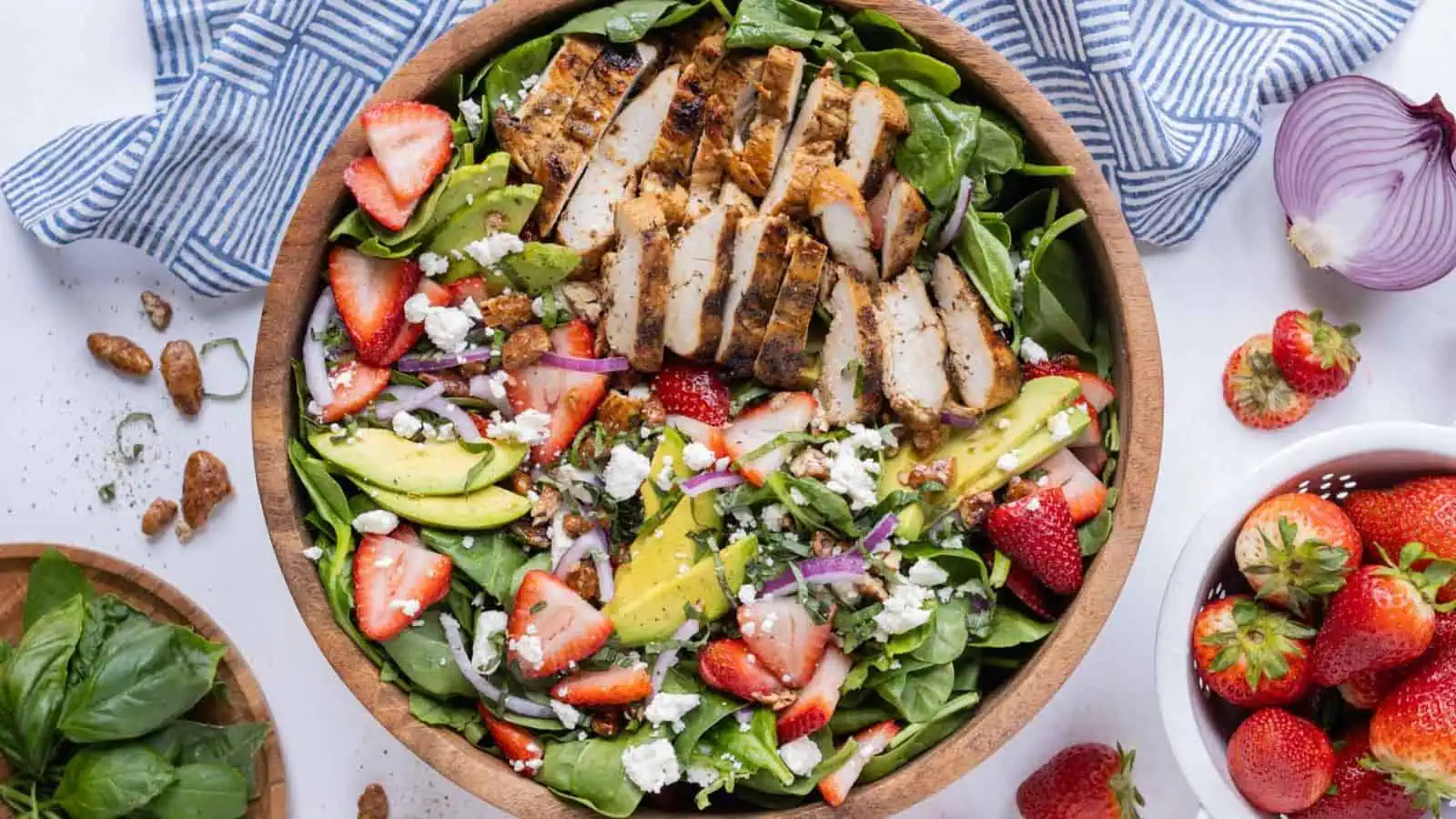 Grilled chicken tops this hearty salad filled with spinach, strawberries, avocado, and feta. It’s finished with candied pecans and a homemade vinaigrette. The mix of textures makes it stand out at any gathering. Leftovers hold up well for lunch the next day.