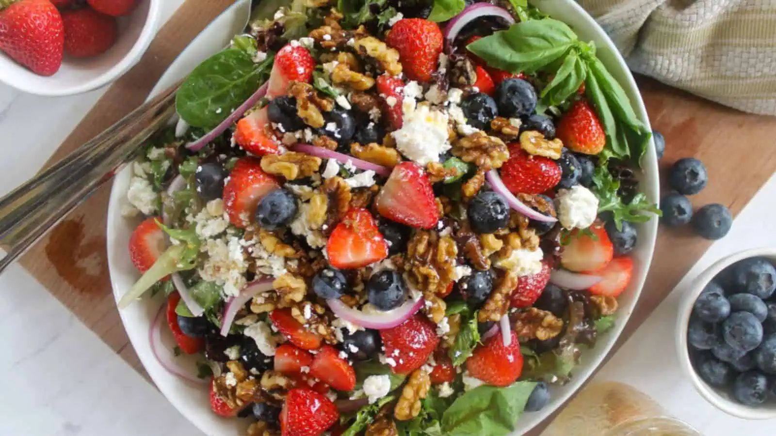 Bright and colorful, this salad is great for summer picnics and potlucks. It combines strawberries, blueberries, walnuts, and goat cheese with a honey dijon vinaigrette. Chill it before serving for best results. It’s one of the most versatile berry salad ideas you can keep in your recipe file.