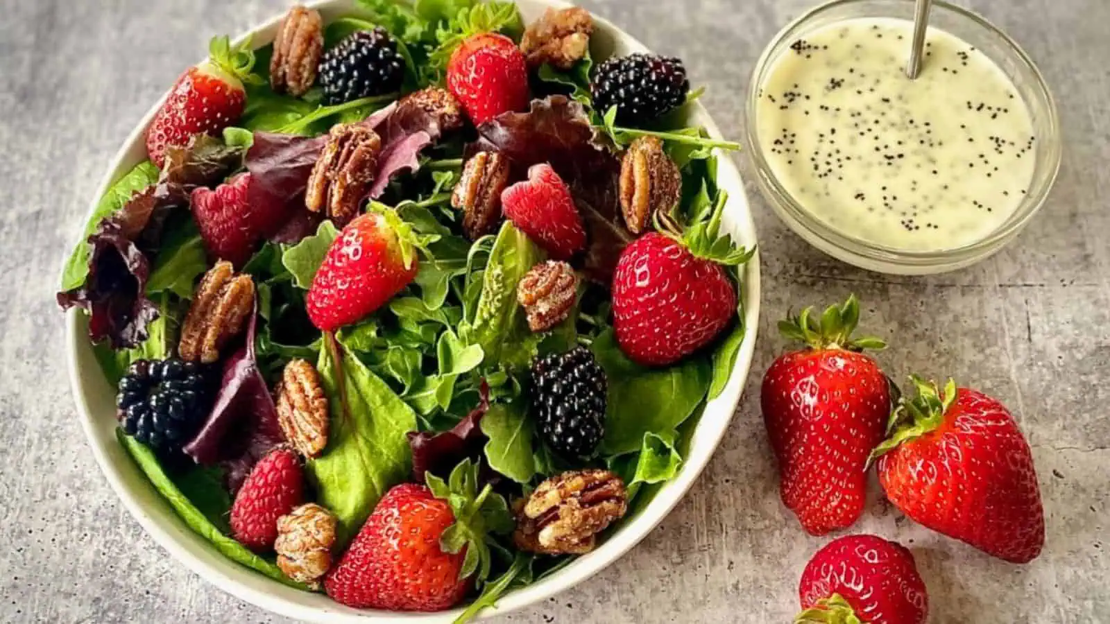 Mixed greens, fresh berries, candied pecans, and poppy seed dressing come together in this light salad. It’s simple to assemble and always looks great on the table. Use whatever berries you have on hand. This is one of those berry salad ideas that can change with the season.