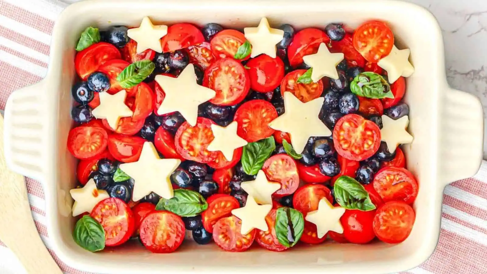 Fresh mozzarella, strawberries, blueberries, and basil come together for this festive caprese. The red, white, and blue colors make it perfect for patriotic holidays. You can prep it in advance, but it’s best served chilled. It’s simple and always a crowd favorite.