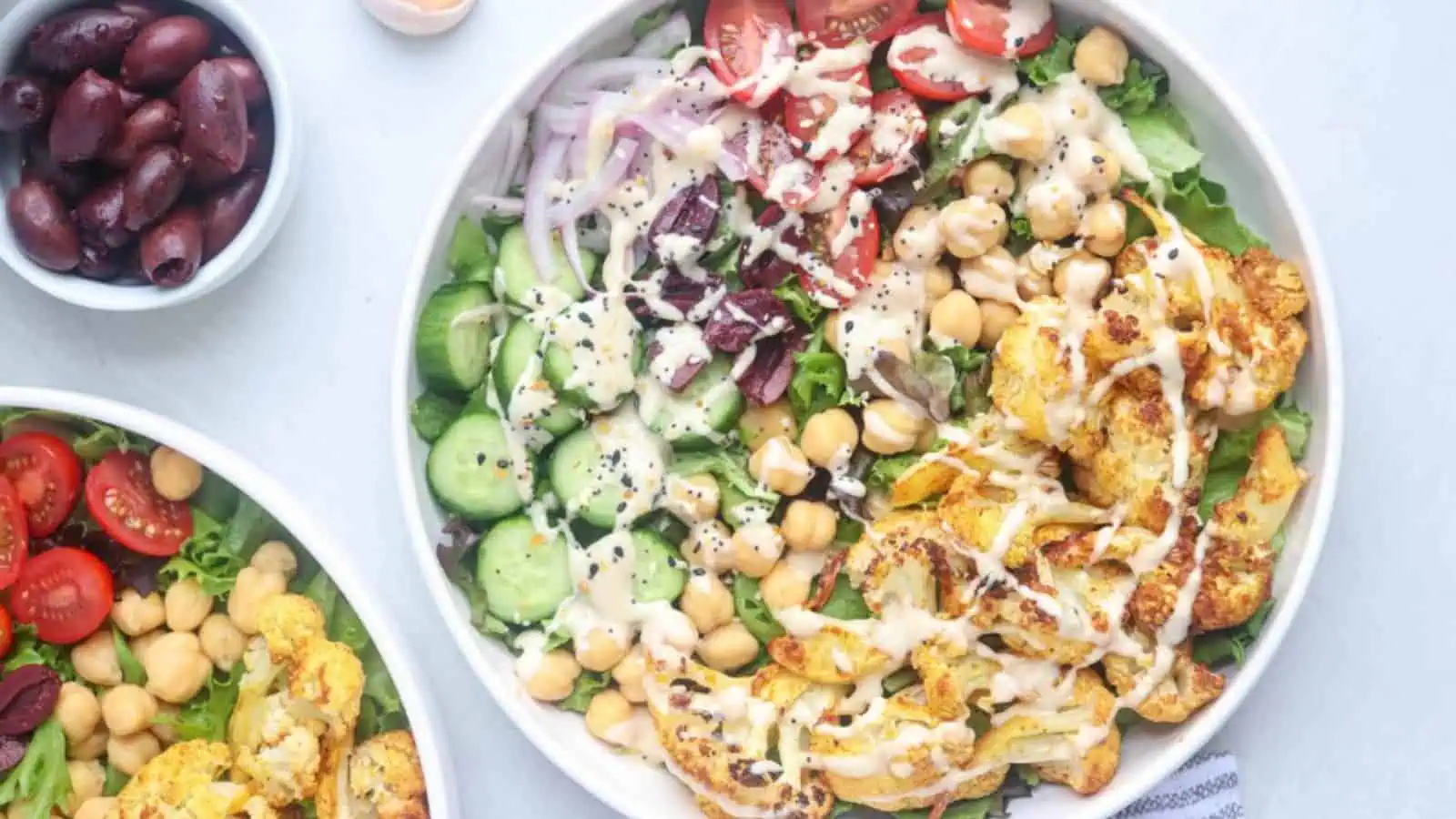 These bowls start with spiced roasted cauliflower and get layered with chickpeas, olives, and greens. Everything is finished with a tangy tahini dressing. The mix of flavors and textures makes it feel like a complete meal. It’s great for lunch or a simple plant-based dinner.