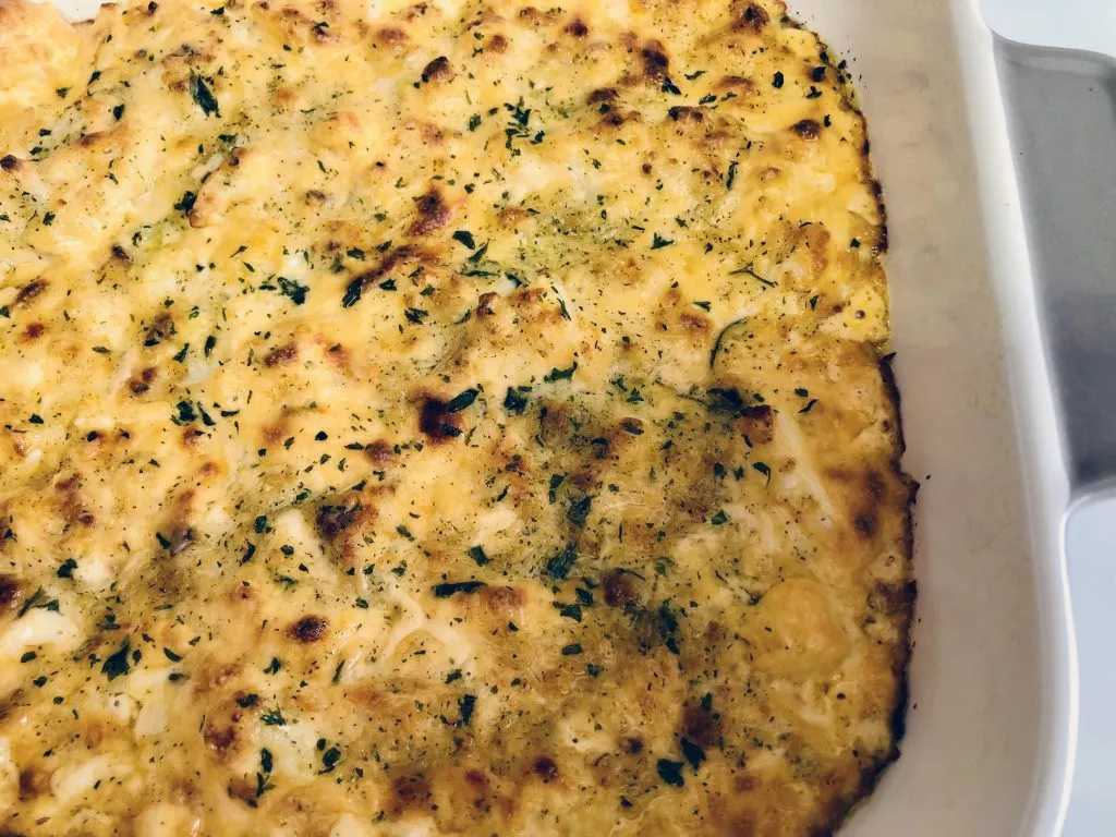 - Pour cauliflower mixture into aย buttered baking dish, sprinkle on the topping mixture,ย and bake for 15-20 minutes until bubbly, then broil for just a few minutes to brown and crisp the top