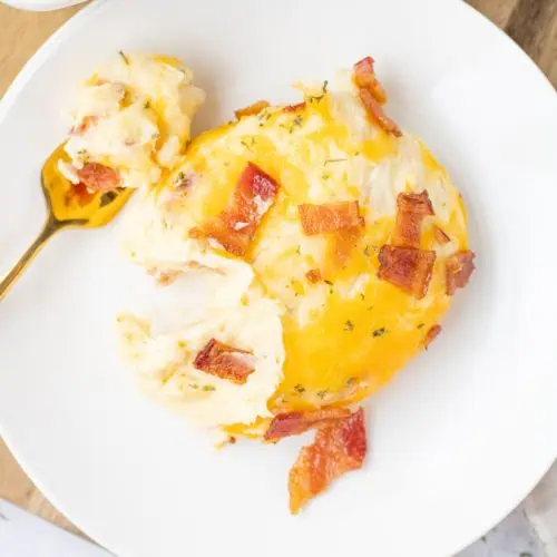 If youโre craving the ultimate cozy side, these cheesy mashed potatoes with bacon are it. Fluffy Yukon golds get whipped with cream cheese, butter, and parmesan, then baked under a blanket of triple cheddar with crispy bacon on top. Golden edges, melty middle, and serious crowd-pleaser energy.