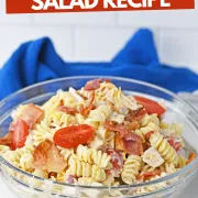 Chicken Bacon Ranch Pasta Salad is the perfect cold summer pasta salad that you can enjoy as a complete meal or side dish. Simply combine chopped chicken, juicy tomatoes, sweet red onion, crispy bacon, shredded cheese, and creamy ranch dressing.