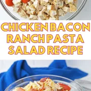This Chicken Bacon Ranch Pasta Salad can be enjoyed as a complete meal with a serving of homemade Cheddar Jalapeno Cornbread, breadsticks, soft pull-apart rolls, or Instant Pot Corn on the Cob.