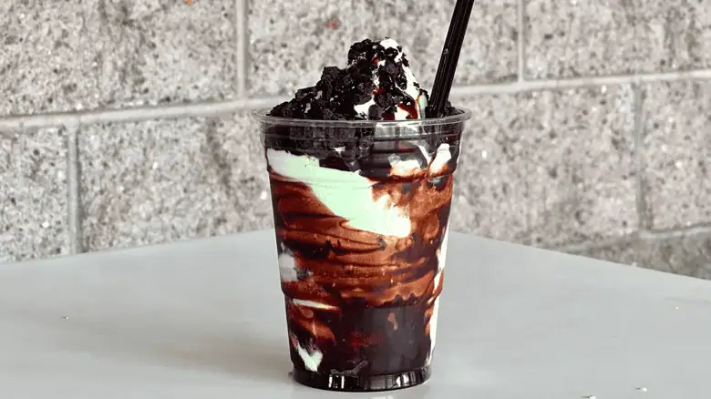 This decadent dessert features a base of creamy mint soft serve that is both light and airy. It is layered with a rich, thick chocolate fudge sauce and a generous helping of chocolate cookie crumbles. The cookie pieces are denser than your average oreo, offering a satisfying crunch that mimics a Thin Mint. You can also choose a mint-vanilla swirl if you prefer a slightly milder flavor profile.