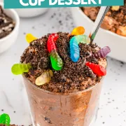 Dirt worm cups are fun and delicious dessert cups consisting of chocolate pudding, crushed Oreo cookies, mini marshmallows, chocolate chips, and whipped topping.