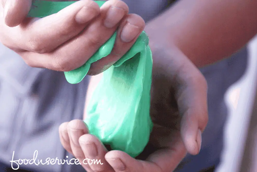 - Slowly add in the buffered saline solution and mix thoroughly. Add the saline solution to your slime mixture a little bit at a time. You will feel it tighten up more and more as you add it in. You can stop adding it in once you get to your own desired texture and density.
