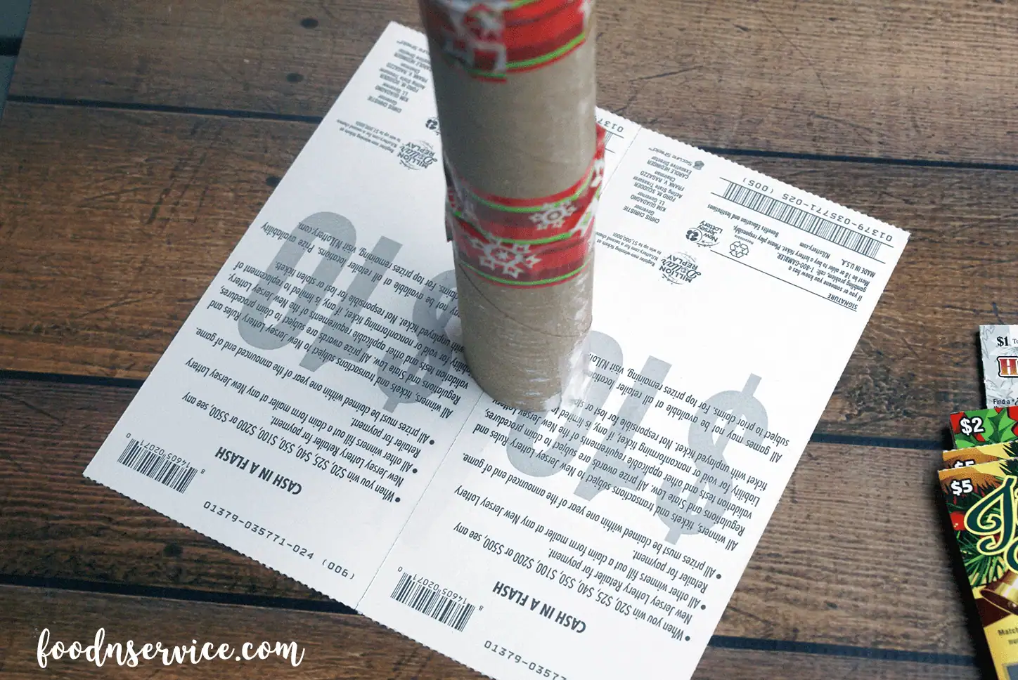 Then add a layer of the $2 lottery scratch off tickets. You want to come up almost an inch. Leave some space for the tickets going up the toilet paper roll. You're going to need.
