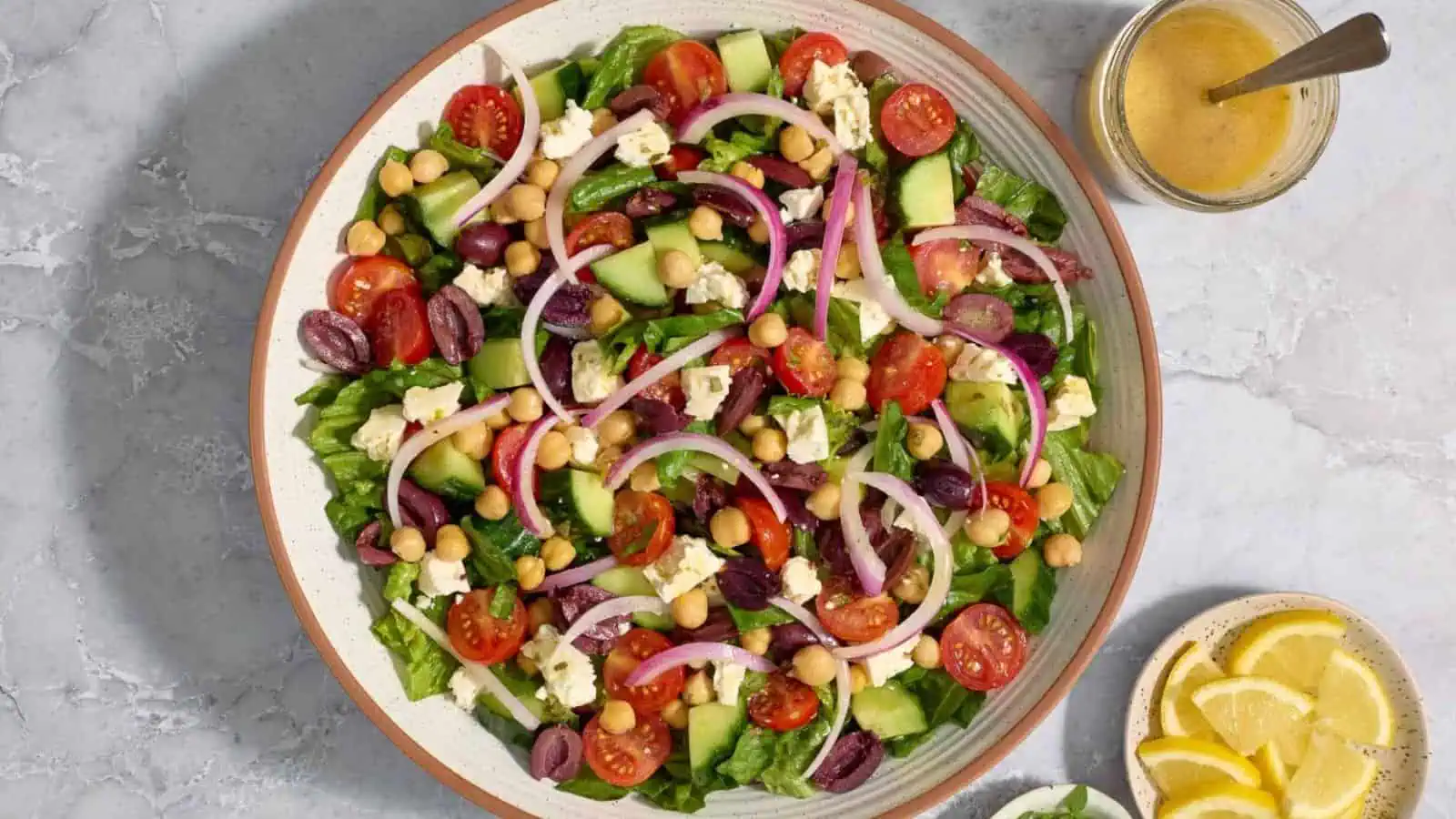 This salad doesnโt mess around. Crisp cucumbers, briny olives, juicy tomatoes, and plenty of feta bring all the best Greek flavors to the table. Whether you eat it on its own or pile it onto some pita, itโs always a solid choice.