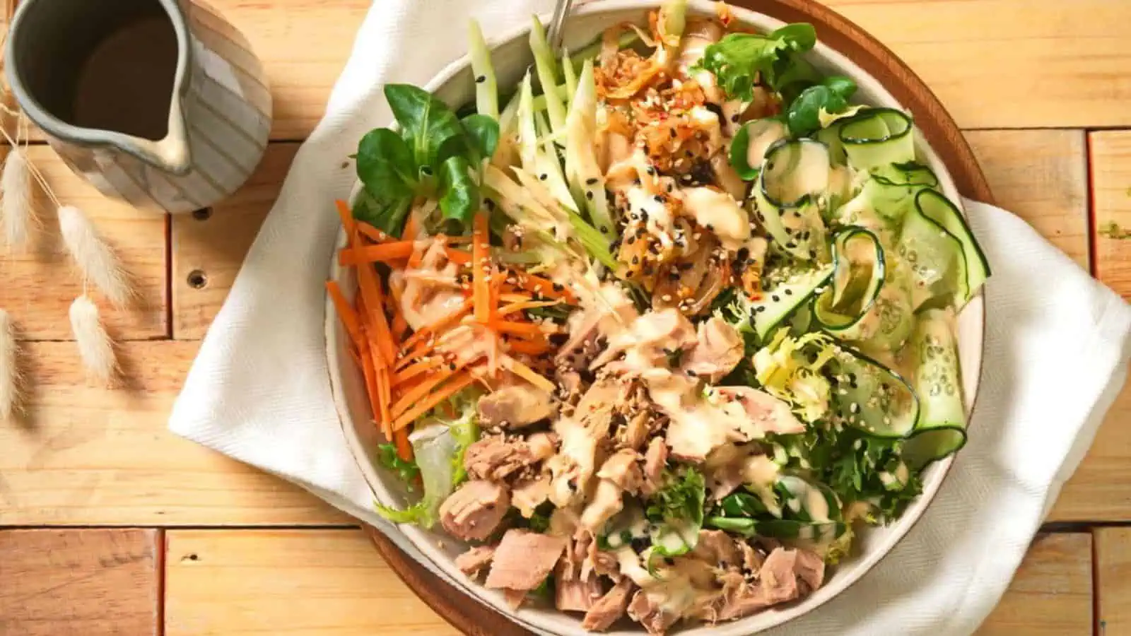 Bold, spicy, and just a little unexpected, this kimchi salad brings major flavor. Mixed veggies and tangy dressing round it out, making it the kind of dish that wakes up your plate. If your usual salads feel a little too safe, this oneโs got your back.