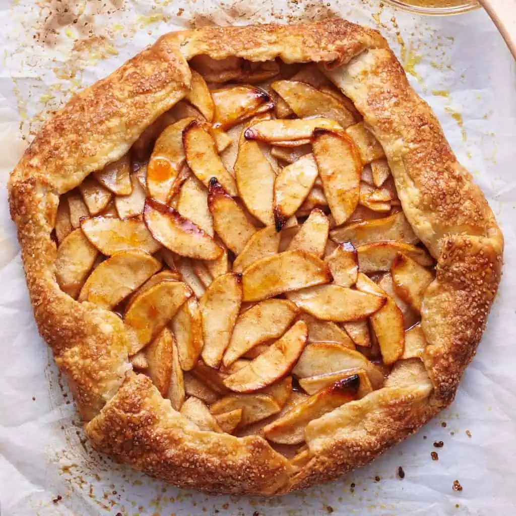 This free-form pie proves that imperfection is part of the charm. Thin apple slices tossed in brown sugar and cinnamon are layered over flaky pastry, folded at the edges, and baked until caramelized. A dusting of powdered sugar or drizzle of honey completes the look. Rustic, fragrant, and effortlessly Instagrammable it’s fall in pastry form.