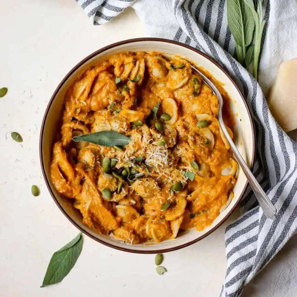 Skip the jarred sauce this pumpkin sage pasta is creamy, savory, and surprisingly simple. Stir pureed pumpkin into a butter-sage sauce with a touch of garlic and cream, then toss with fettuccine. The golden-orange hue pops beautifully against a dark bowl, making it both dinner-party-worthy and picture-perfect.