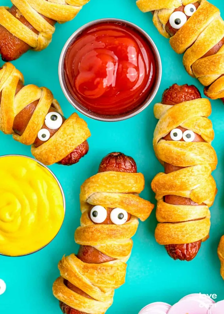Mummy Hot Dogs are the perfect Halloween meal that your guests will adore. Made in about 20 minutes, These spooky pigs in a blanket will not only fill up your family and friends but leave a smile on their faces.