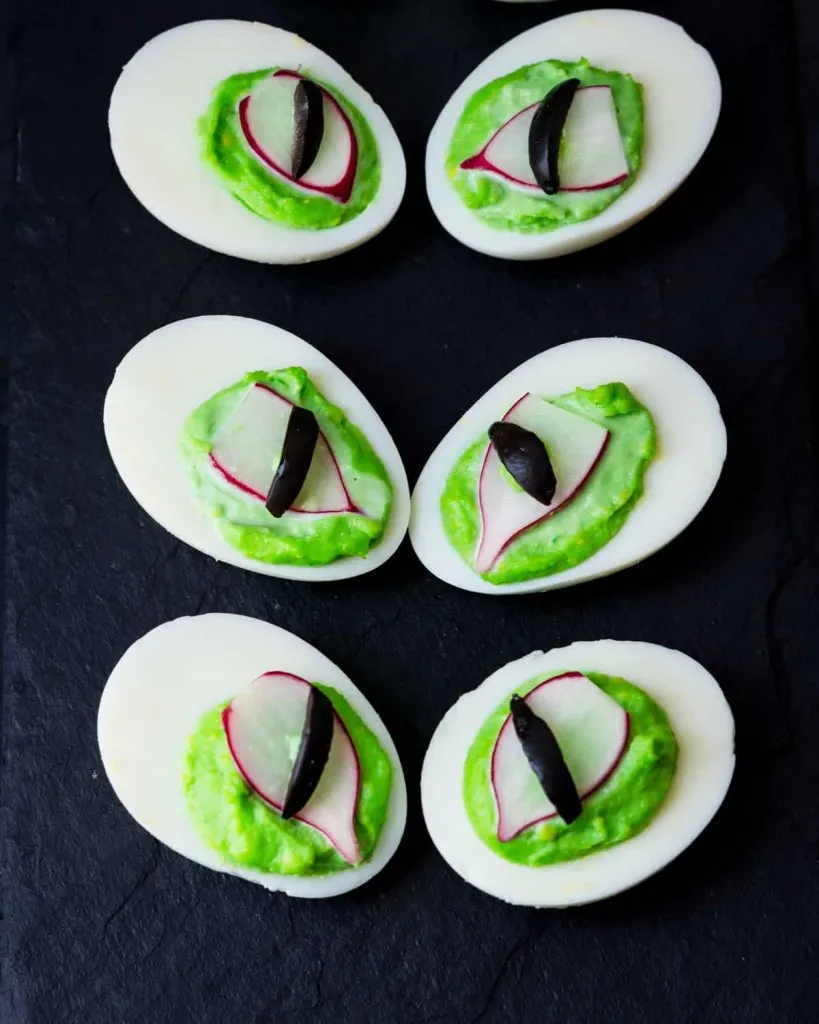 The filling is spiked with wasabi paste for a tingly bite that will keep people coming back for more. These Halloween deviled eggs remind me of a demon cat's eyes, but you can give these spooky eyes your own clever moniker.