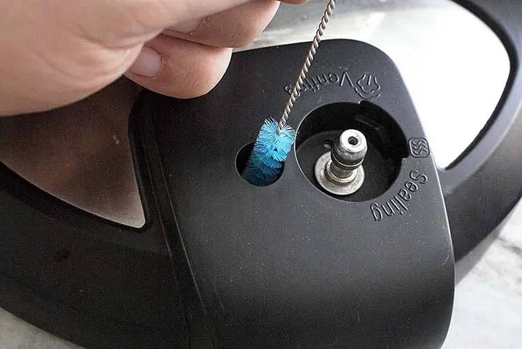 Use a bristle brush and warm soapy water is a great way to clean the venting hole of the pressure pin float valve. Food and grime can get into there. This is something that I clean on a weekly basis.