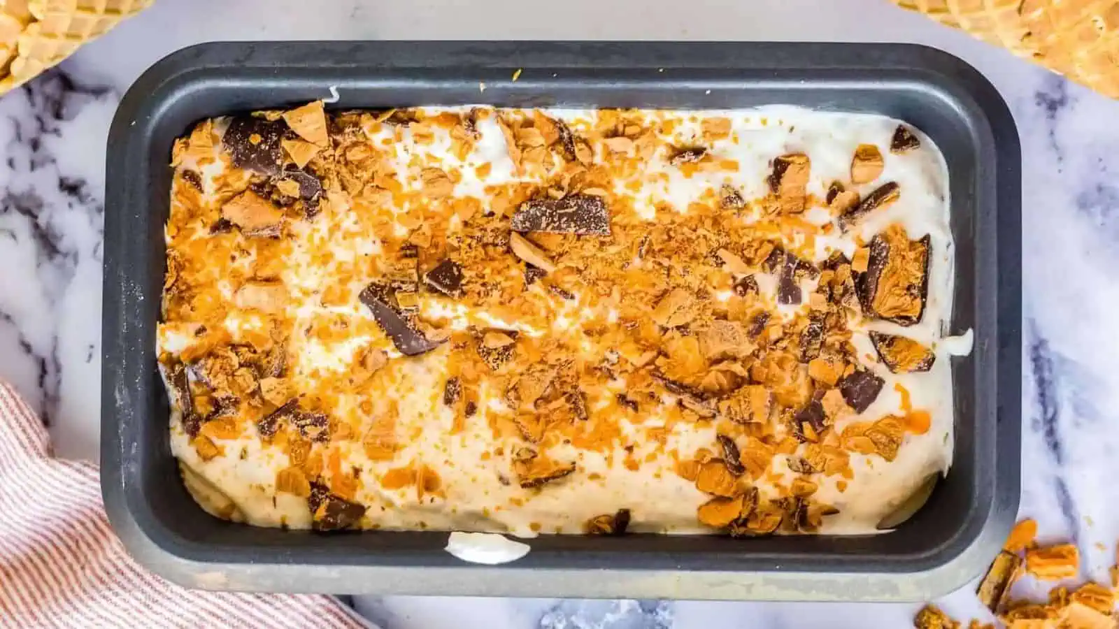 Packed with peanut butter, fudge, and Reese’s pieces, this ice cream goes big on flavor. It’s one of those mix-and-freeze recipes that doesn’t slow you down. If you’re short on time but still want dessert with bold ingredients, it’s a solid pick.