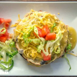 • Shred chicken and begin assembling stacks by adding cheese, chicken, and sauce to each tortilla layer. Garnish each top tortilla with cheese, lettuce, and tomato, and serve.