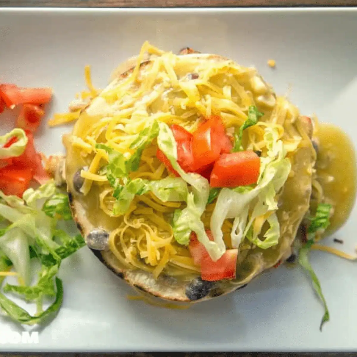 - Shred chicken and begin assembling stacks by adding cheese, chicken, and sauce to each tortilla layer. Garnish each top tortilla with cheese, lettuce, and tomato, and serve.
