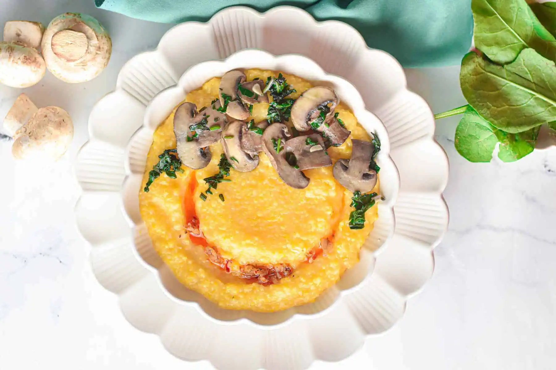 - Serve this creamy polenta hot with sautéed mushrooms and spinach on top. Garnished with chilli garlic oil.