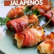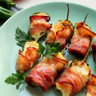 Bacon Wrapped Jalapenos are jalapeno peppers stuffed with a cheesy filling and wrapped in slices of bacon, then baked in the oven. They can be served as an appetizer or as a lunch or light dinner dish on their own.