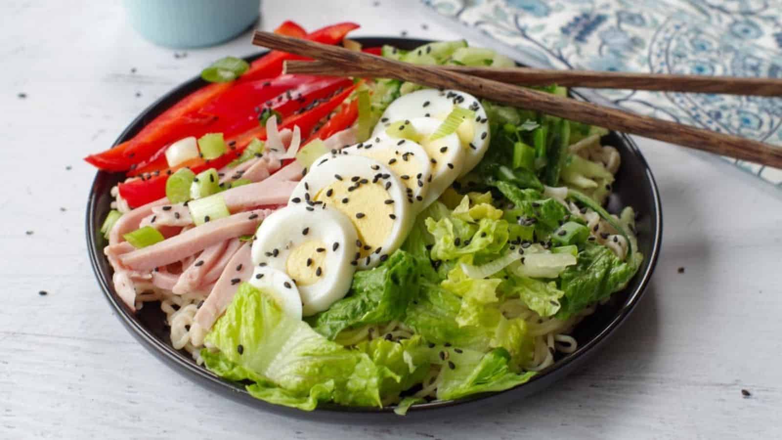 This noodle salad is chilled, veggie-packed, and quick to prep. It’s based on a North American-style version of a Japanese summer dish, so it's familiar yet fresh. Add leftover ham or tofu to make it more filling. It’s one of the better light dinner recipes for warmer days.