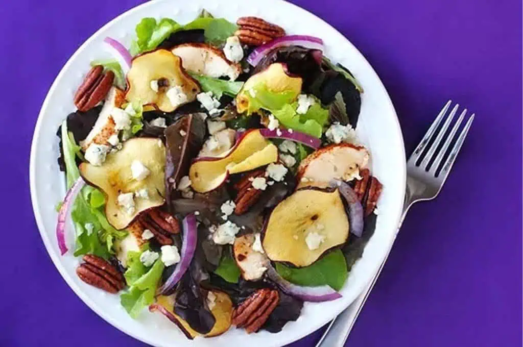 Balancing sweet and savory elements is key in recreating the Fuji apple chicken salad. Begin with mixed greens, adding grilled chicken slices seasoned with a dash of smoked paprika. Thinly sliced Fuji apples contribute tart sweetness, while Gorgonzola crumbles offer a tangy punch.