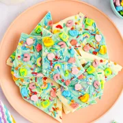 This white chocolate bark is fun and colorful and topped with delicious Lucky Charms marshmallows and sprinkles.