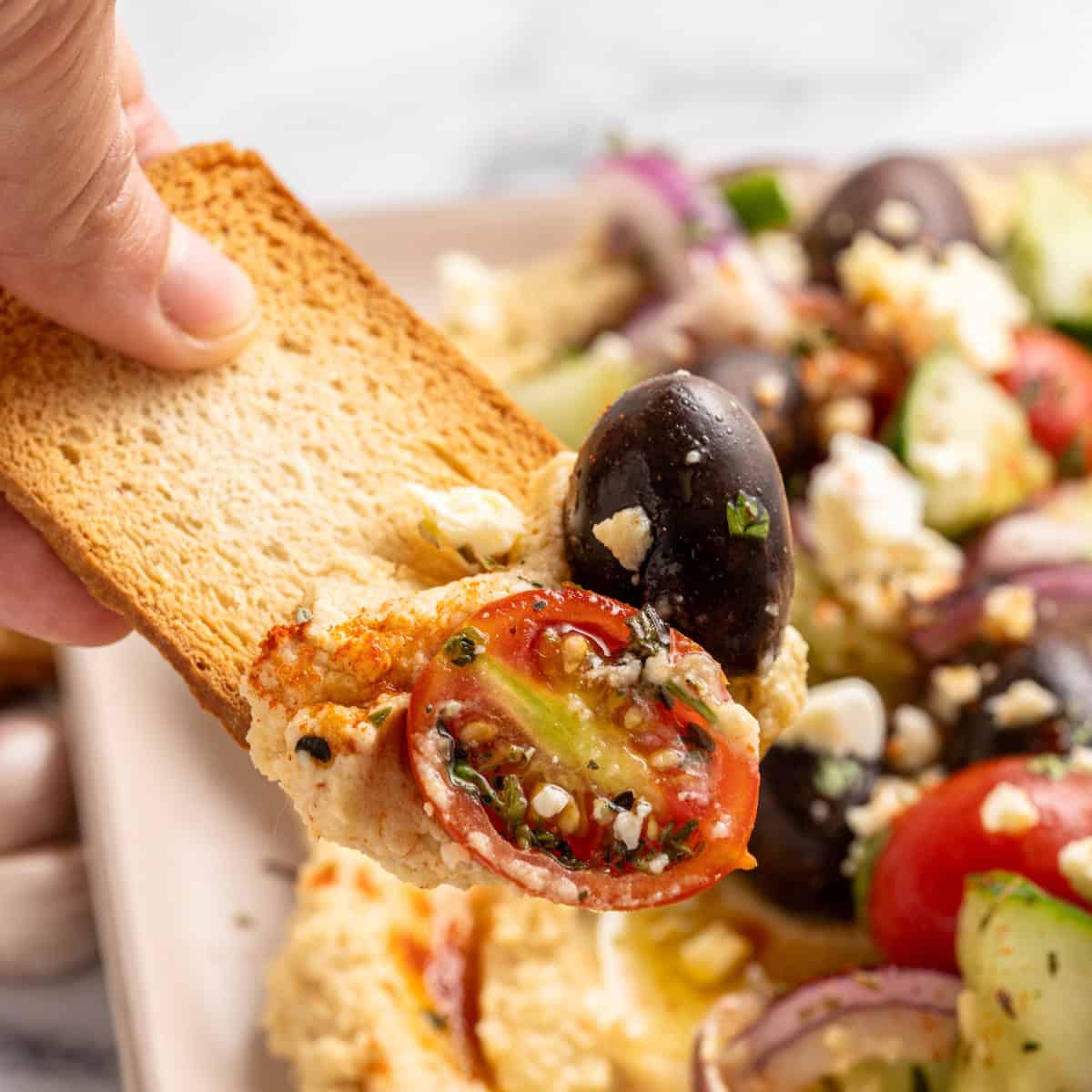 - Fresh toppings – I've topped this Mediterranean hummus with halved cherry tomatoes, quartered cucumbers, Kalamata olives, crumbled feta cheese, fresh chopped parsley, thinly sliced parsley, thinly sliced red onion, dry oregano, sea salt, ground paprika, and olive oil.