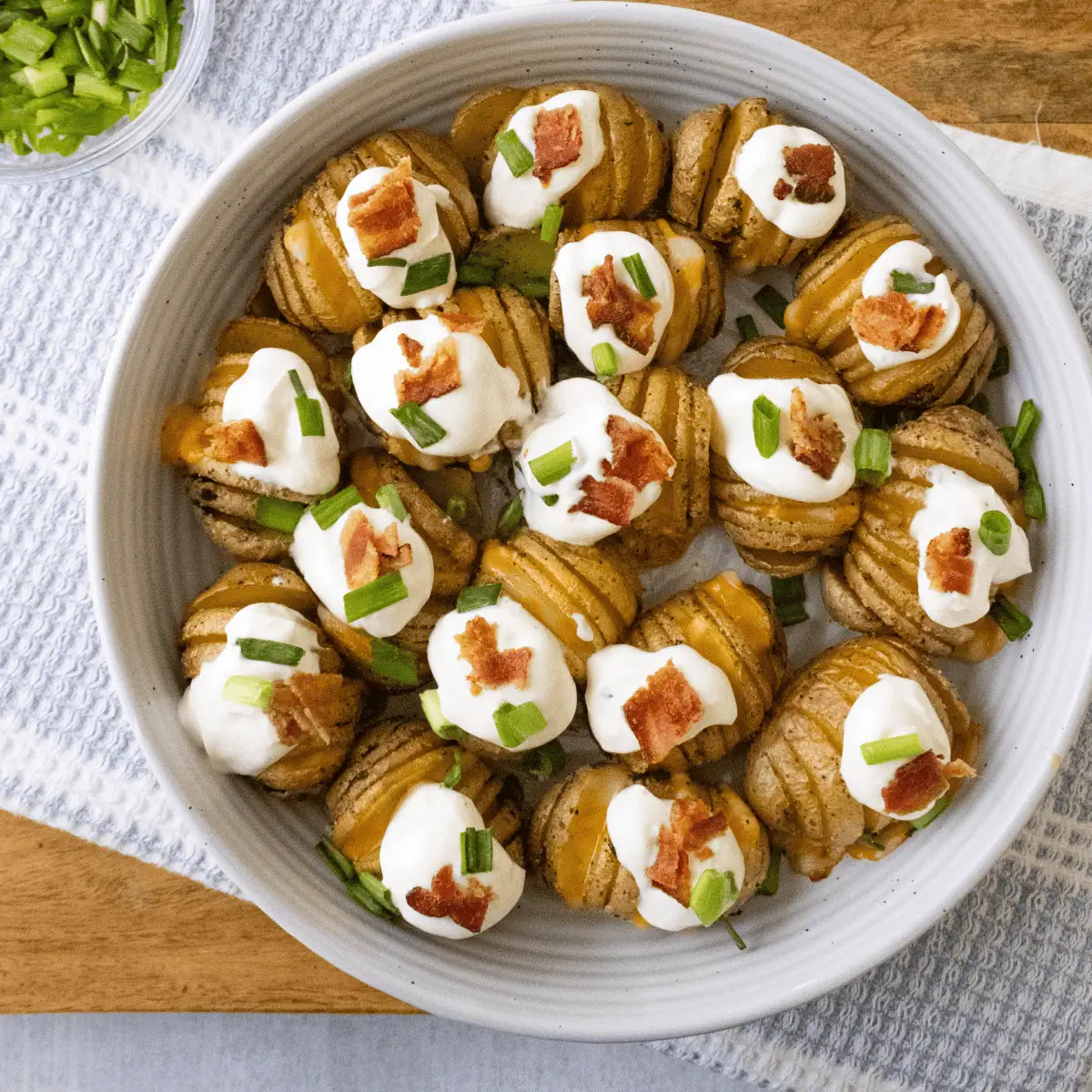 Mini Hasselback Potatoes are creamy and buttery, cut the “hasselback” way to fill with melty cheese and brush with seasoned oil. Once baked and crispy, they're topped with sour cream, green onions, and crispy bacon!