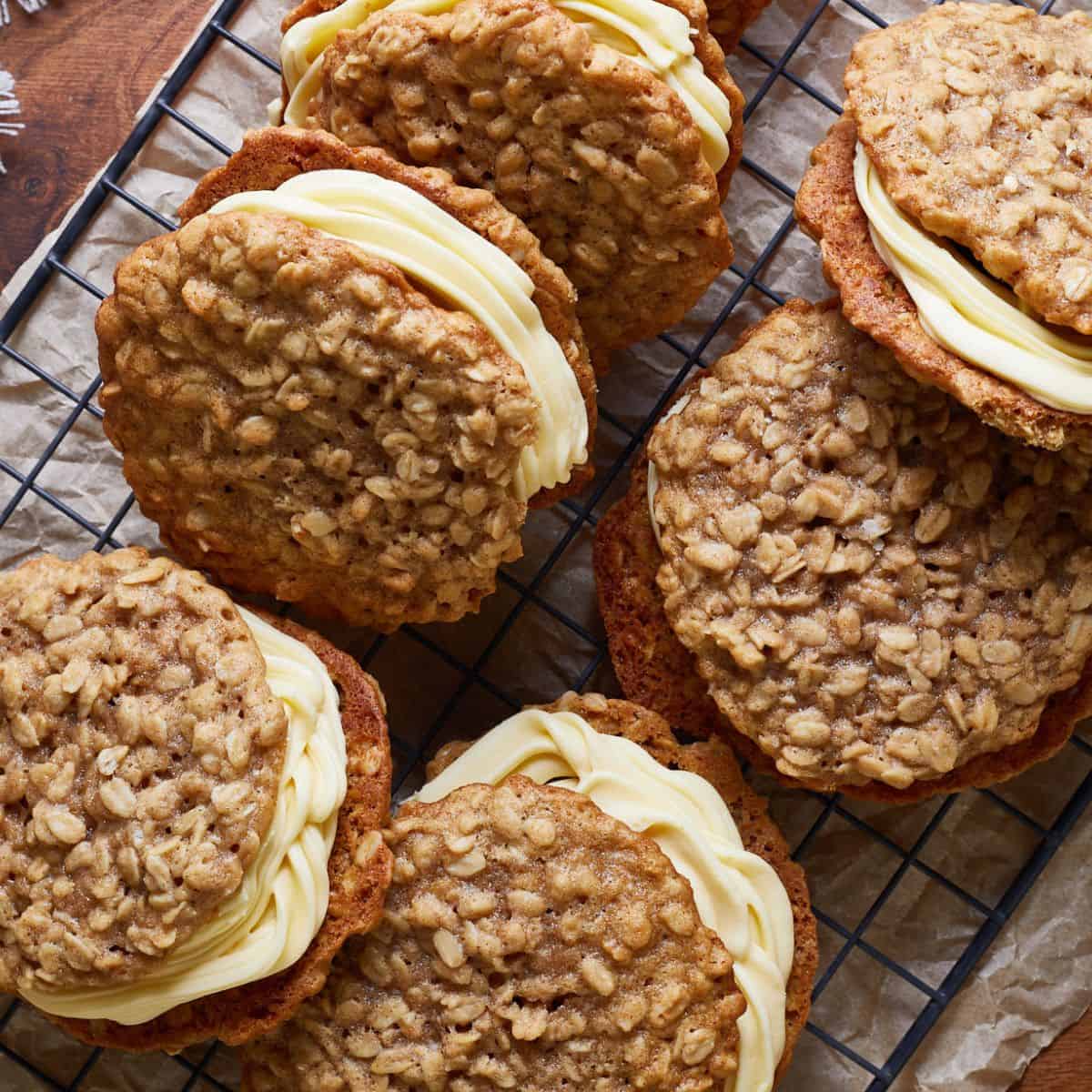 You could also make the cream pie filling 1-2 days before assembling a fresh batch of these oatmeal cookies and store it in a sealed piping bag or airtight container. Give the filling mixture a good store and add a splash of milk to loosen it should it have stiffened in storage.