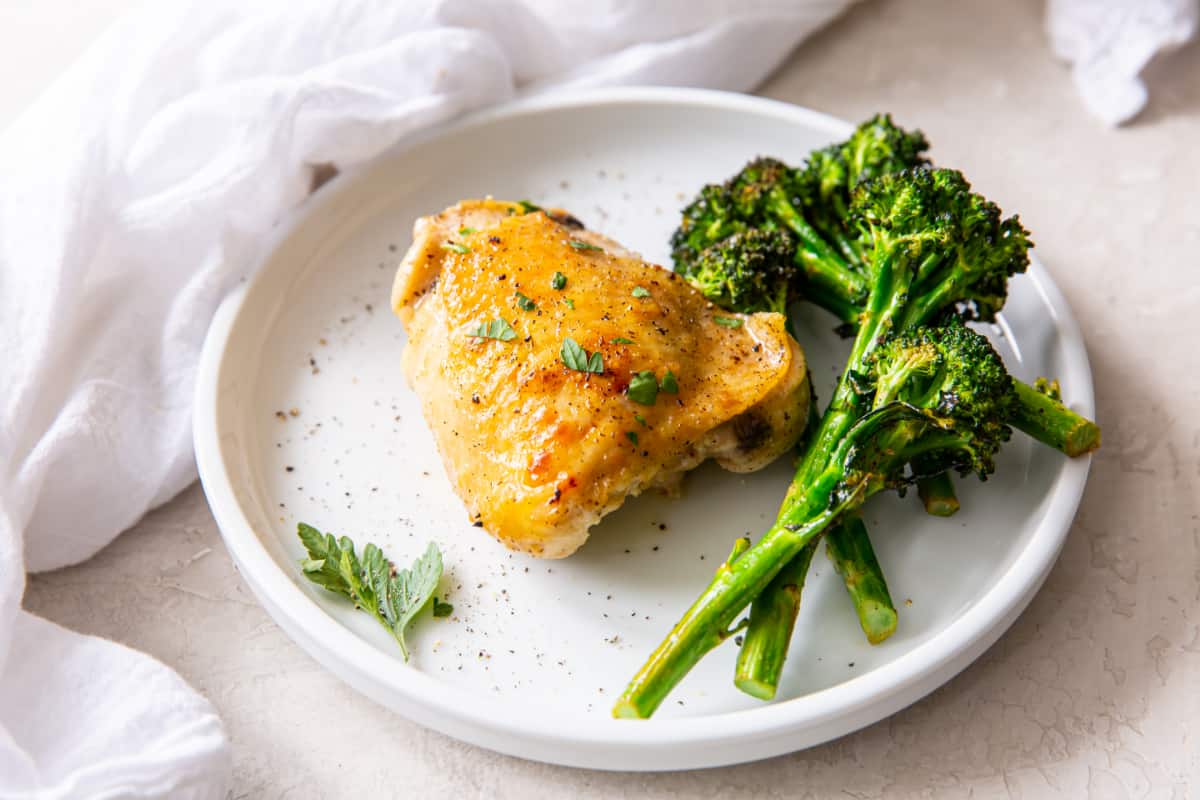 Deliciously juicy oven broiled chicken thighs are ready in less than 25 minutes. With hints of lemon and garlic, this easy, low-carb chicken thigh recipe is great for a weeknight dinner.