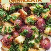 Drizzling refreshing and vibrant homemade gremolata over these crispy red baby potatoes is an easy way to transform a side dish of roasted potatoes into something worthy of presenting alongside Thanksgiving turkey or Christmas lunch!