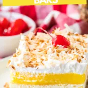 This cocktail-inspired dessert consists of a buttery cracker crust, cheesecake filling, and a pineapple layer made from pudding mix and pineapple-flavored gelatin. Itโs topped with whipped topping, sweetened shredded coconut, and juicy-sweet maraschino cherries!
