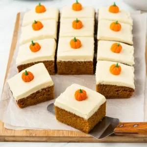 - Slice the cake into squares to serve. Place a fondant pumpkin on top of each square for decoration if desired.