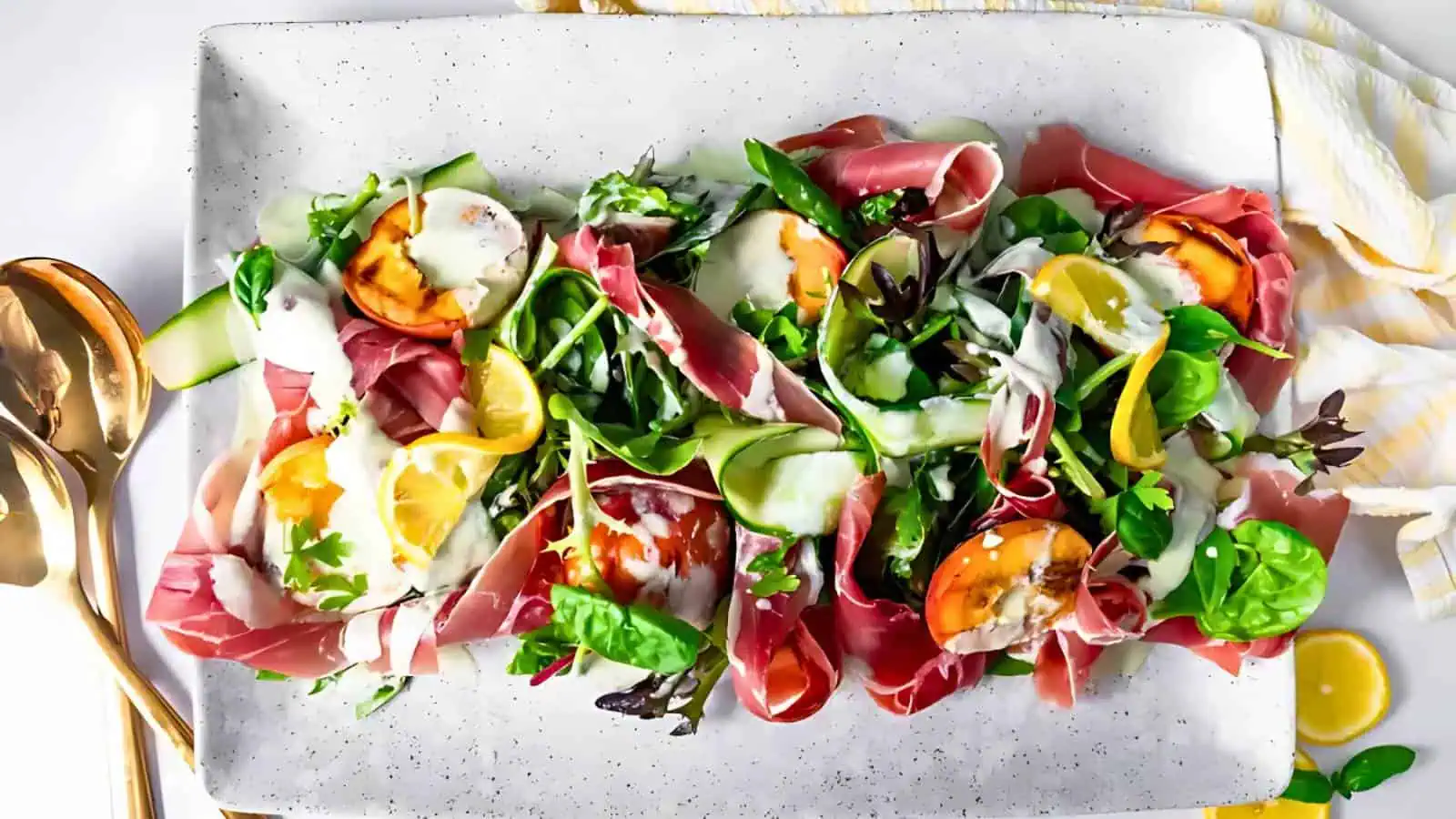 Peach Prosciutto Salad with Yogurt Avocado Dressing