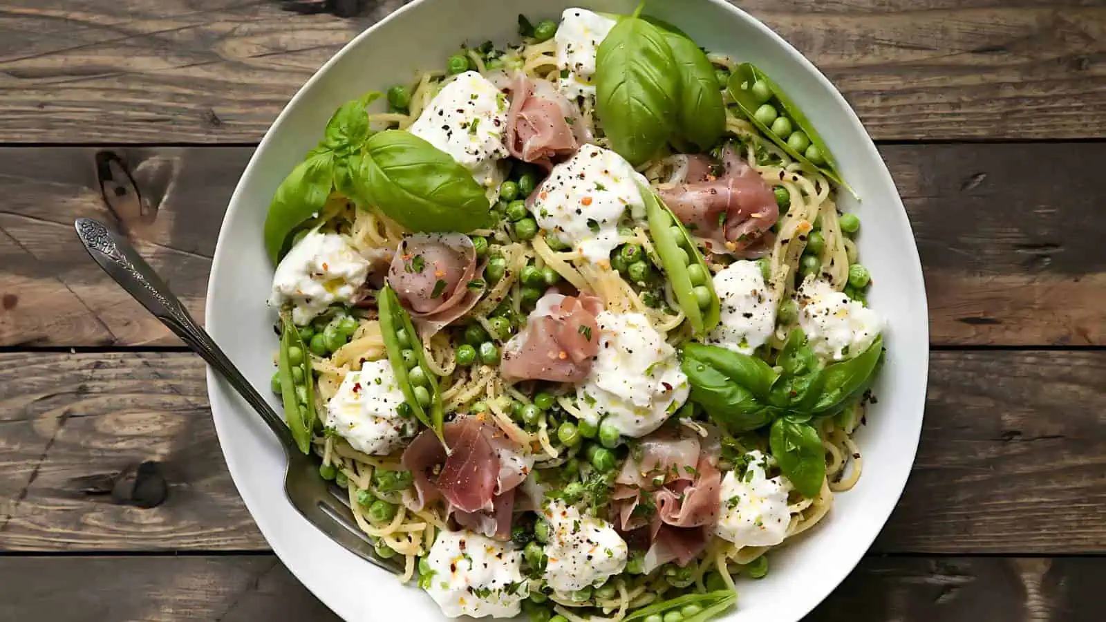 Spring Pea Pasta with Prosciutto and Burrata Cheese